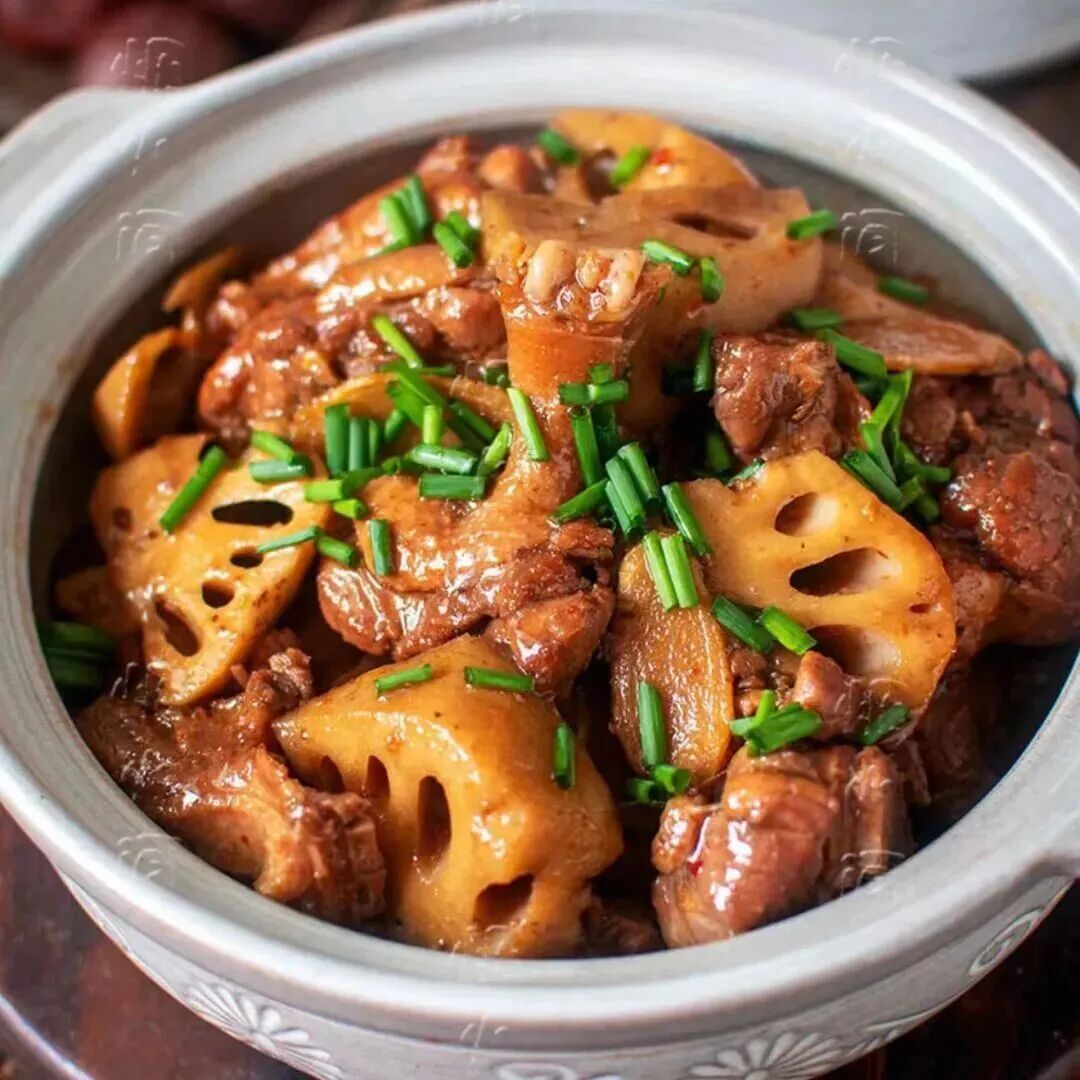 慈姑莲藕焖火腩:将慈姑、莲藕与火腩(烧肉)一起焖煮,口感软糯,味道醇厚。
